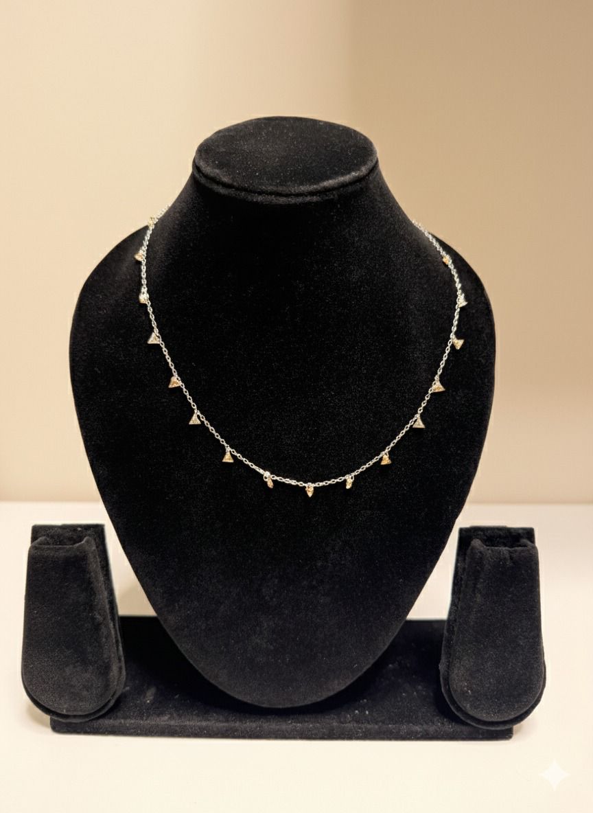 A touch of silver, a sparkle of gold ✨🌟. This 92.5 sterling silver chain adorned with delicate gold crystal charms is a perfect blend of elegance and modern charm. Wear it to elevate your everyday look or make a statement at special occasions — because style is in the details.